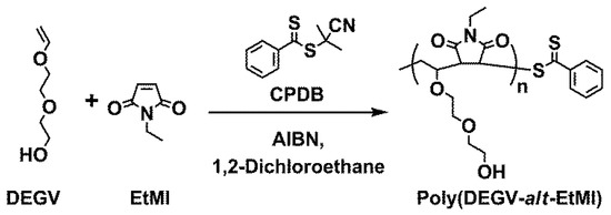 Unless otherwise stated, all commercial reagents were used as received. N-Ethylmaleimide (EtMI; Tokyo Chemical Industry Co., Ltd., Tokyo, Japan, 98%) and 2,2′-azobis(isobutyronitrile) (AIBN; FUJIFILM Wako Pure Chemical Corporation, Osaka, Japan, 98%) were used as received. Diethylene glycol mono vinyl ether (DEGV; Maruzen Petrochemical Co., Ltd., Tokyo, Japan, 99.4%) was dried overnight over KOH pellets, and distilled twice over CaH2. 2-Cyano-2-propyl benzodithioate (CPDB) was prepared according to the literature [23].