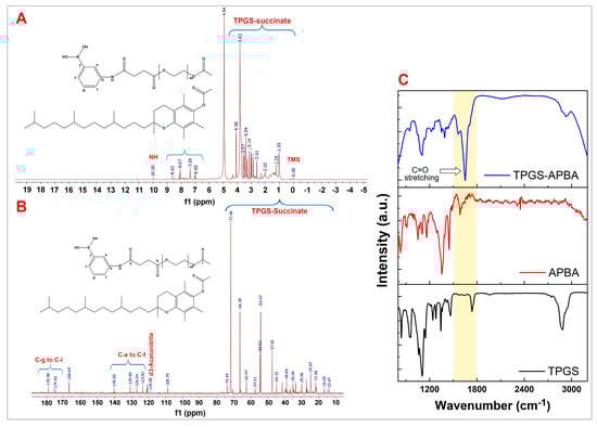 Characterization of functionalized TPGS using proton (A) and carbon (B) NMR (TMS—chlorotrimethylsilane). The right panel shows FT-IR spectral changes during APBA attachment (C).