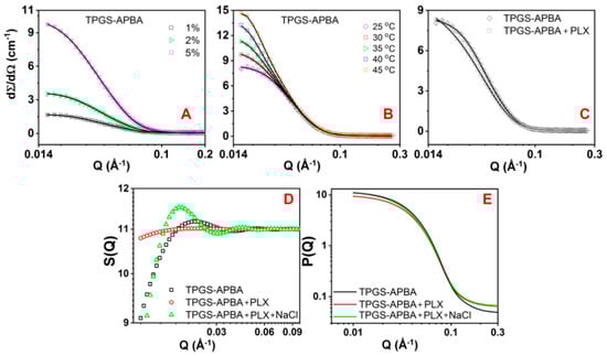 SANS profile showing the effect concentration (A), temperature (B) and PLX incorporation (C) in TPGS-APBA micelles. Bottom panel shows changes in the structure (D) and form (E) factors of TPGS-APBA micelles upon incorporation of NaCl (0.9%) and PLX.