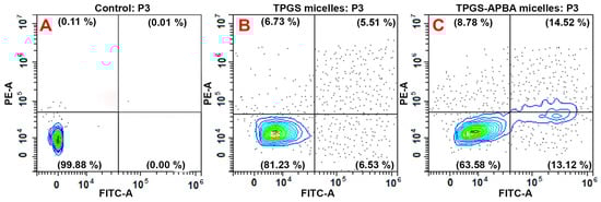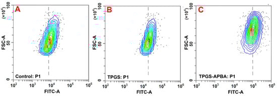 Effect of APBA attachment upon trans-cellular uptake of micelles. Shown are the FACS data for untreated cells (A), and those incubated with TPGS (B) and TPGS-APBA (C) micelles. The cells in (B) and (C) were incubated with FITC-loaded micelles for 4 h.