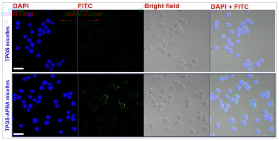Comparison in the cellular uptake of micelles composed of TPGS (upper panel) and TPGS-APBA (lower panel). Cells were incubated with FITC-loaded micelles for 4 h prior to imaging. (nuclei—blue, micelles—green). The scale bars represent 10 µm.