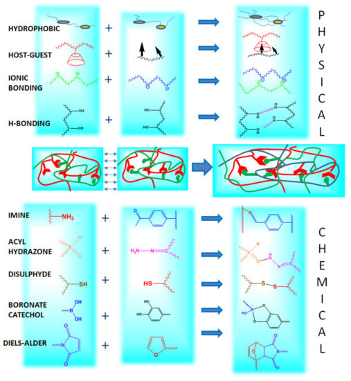 Typically, the mechanisms promoting self-healing capability, which are based on dynamic interactions, can be classified as covalent reactions that lead to the chemical crosslinking of the polymer/s, and supramolecular assembly, based on physical interactions (Figure 1).