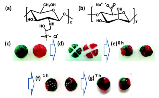 Self-healing process of hydroxypropyltrimethylammonium chitosan chloride (HACC)-alginate-based polycomplex. (a,b) Chemical structure of HACC and alginate respectively. (c–e) Two coloured disk-shaped hydrogels cut into 4 pieces and put back together. (f,g) Self-healed hydrogel after 1 and 7 h. Reproduced from Y. Ren et al. A self-healing hydrogel formation strategy via exploiting endothermic interactions between polyelectrolytes, 2016 [102], with permission from The Royal Society of Chemistry.