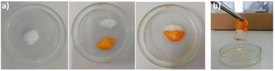 A few works have focused on hyaluronic acid and chitosan-based polycomplexes, which provide the possibility of in situ gel formation as well as rapid self-healing process thanks to ionic interactions. In this case, the mixture of chitosan and hyaluronic acid in adequate pH (~4) leads to the formation of a hydrogel with ability to self-repair in 2 min (Figure 3) [51]. In order to measure the mechanical response of the synthesized hydrogels, different cut-recovery cycles (2) were applied and the results showed that after the self-healing process a new material can be obtain with properties nearly as good as the original hydrogel, which opens a new research line with promising opportunities in the biological field.