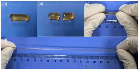 Self-healing experiments. (a) Original hydrogel. (b) Original hydrogel after being cut. (c) Self-healed hydrogel after healing for 2.5 h and (d) stretching of self-healed hydrogel. Reprinted from self-healing and conductivity of chitosan-based hydrogels formed by the migration of ferric ions [106]. Copyright © 2020 Wiley Periodicals, Inc.