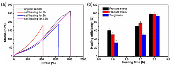 Nevertheless, multiple coordination bridges established by coordination metals are a promising way to add a second reversible network to covalently crosslink hydrogels, and thus, to gain high mechanical stability as well as an efficient self-repairing ability. Typically, chemically crosslinked hydrogels are obtained by in situ polymerization of poly (acrylic acid), polyacrylamide or their copolymers that are also coordinated with metallic cations like Fe3+ to add physical crosslinking points due to electrostatic interactions to the polymerized networks [106]. As aforementioned, the use of synthetic polymers for biomedical research is limited and, therefore, in situ hydrogels with self-healing properties based on polysaccharides are increasingly investigated. As aforementioned, chitosan is one of the most used biopolymers for the development of hydrogels based on polysaccharides. For example, double-crosslinked chitosan hydrogels were prepared by combining the in situ free-radical polymerization of acrylic acid monomer and reversible coordinative interactions between water soluble chitosan and Fe3+ ions that provide a hydrogel with good mechanical properties and ability to self-repair [106]. The results showed that in situ hydrogels based on chitosan had excellent efficiency for self-repair (98%) and were able to achieve total self-repair in just 2.5 h (Figure 6). Finally, the mechanical properties of the hydrogels after being fractured were compared with the original hydrogel and it was seen that after 2.5 h of self-healing, there were no changes in the mechanical properties, for example, the elongation at break could reach up to 1900% and its maximum tensile strength was about 280 kPa in both cases (Figure 7).