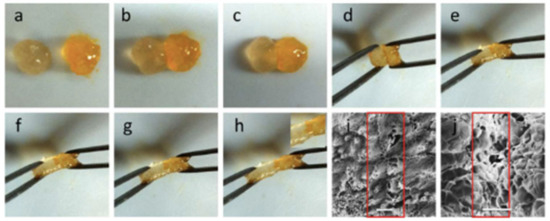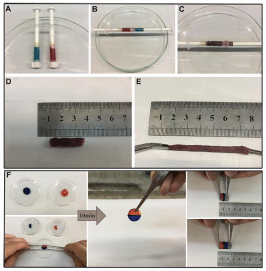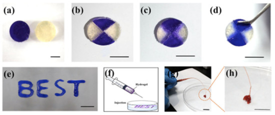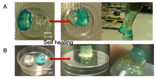Other polysaccharides, such as gelatin, have also been employed in the development of in situ self-healable hydrogels. Vahedi et al. [112] developed a new gelatin-based in situ hydrogel prepared by Schiff-base reaction. Gelatin is a natural, biocompatible and biodegradable polysaccharide that presents amino groups in its backbone which are suitable for reacting with poly(ethylene glycol) di-benzaldehyde without the need for borax or any other type of chemical agent. The hydrogels are created in no more than 20 s and show high capacity to be injected, as well as quick self-repair (10 min) without the need of any external factor (Figure 9) thanks to the dynamic imine bonds. This rapid self-healing and ability to be injected confers to the hydrogel the opportunity to be extruded through a syringe which, as shown in Figure 9, the mixture of half of the hydrogels merged perfectly due to the combination of both colors.