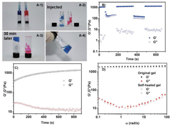 (A) Self-healing after injection. (B–D) Rheological characterization of (B) Chitosan/Poly/ethylene glycol hydrogel deformation and recovery. G′ (filled symbols) and G″ (empty symbols). (C) G′ and G″ with time during the self-healing process. (D) Comparison of original and self-healed hydrogels. Reproduced by permission of The Royal Society of Chemistry from B. Yang et al. Facilely prepared inexpensive and biocompatible self-healing hydrogel: a new injectable cell therapy carrier [56].
