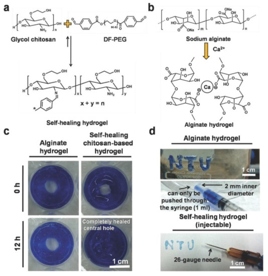 - Liu, Y.; Hsu, S.H. Synthesis and biomedical applications of self-healing hydrogels. Front. Chem. 2018, 6, 1–10. [Google Scholar] [CrossRef] [PubMed]