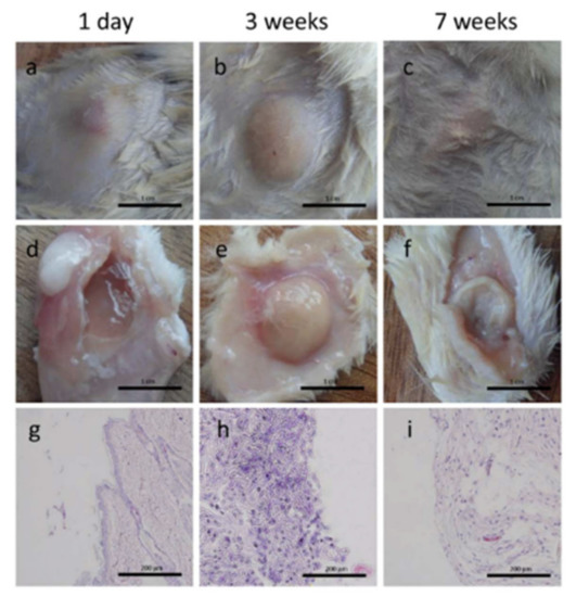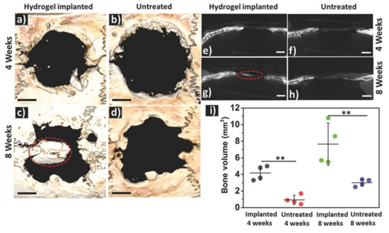 Other studies have also relied on GCH-DF-PEG hydrogels for biomedical applications so as to obtain in situ self-healing hydrogels [113]. In the case of Figure 11, the self-healing process is studied in a different way from that shown in Figure 10. In this case, the GCH-DF-PEG gels were able to regenerate a hole in the center of the material while the alginate hydrogels used in this case as a control could not regenerate. Once again, it is clear that the Schiff-base bonds are pseudo-covalent which makes them capable of re-establishing after fracture. More recently, hyaluronic acid has been included to GCH-DF-PEG hydrogels leading to semi-interpenetrating polymer network with improved injectability and differentiation of in vitro loaded neural stem cells [114].