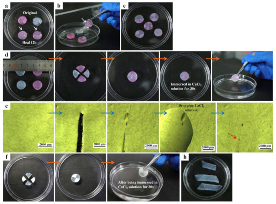 Another study that has revealed the interest in combining oppositely charged polysaccharides [103] used chitosan, guanidine hydrochloride and poly (acrylic acid) in order to obtain a ionically crosslinked matrix with pH-responsive ability and self-healing. When the pH of the system increases (pH ~ 8), the carboxylic acid moieties of poly (acrylic acid), the hydroxyl groups of guanidine hydrochloride and amine groups of chitosan became deprotonated and the ionic interactions between the three compounds are switched on. The self-healing study revealed that the hydrogel was able to self-heal itself in a few hours by recovering its initial shape owing to ionic interactions (Figure 4). Moreover, the gelation of the hydrogel seems to be suitable for drug delivery or 3D cell culture applications as the pH induced a rapid sol-gel transition.