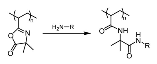 - Tully, D.C.; Roberts, M.J.; Geierstanger, B.H.; Grubbs, R.B. Synthesis of Reactive Poly(vinyl oxazolones) via Nitroxide-Mediated “Living” Free Radical Polymerization. Macromolecules 2003, 36, 4302–4308. [Google Scholar] [CrossRef]