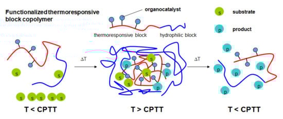 Increasing sustainability in chemical reactions, chemical processes, and materials is one of the major challenges in modern times. The design of energy-efficient chemical reactions using recyclable catalysts and avoiding toxic reaction media are key aspects of green chemistry []. Catalyst immobilization mostly expands catalyst usability due to increased stability, improved solubility, and facilitated recycling [,,,]. Additionally, the use of stimuli-responsive polymers as catalyst supports offers the opportunity of reversibly tuning the catalyst activity by altering environmental parameters (temperature, pH, ionic strength, etc.) [,].