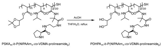 Deprotection of the solketal group was done according to a literature-known procedure []. A mass of 0.5 g of the PSKA-b-P(NIPAAm-co-VDMA-prolinamide) block copolymer was dissolved in a mixture of 10 mL THF and 15 mL glacial acetic acid. The solution was heated to 90 °C and stirred for 6 h. During the reaction time, 24 mL deionized water was added portion-wise. The solvent was evaporated, residual acetic acid was removed by subsequent dialysis against 0.01 M sodium hydroxide solution and water (Spectra Por® 6 dialysis membrane MWCO 1000, Spectrum Chemical, New Brunswick, NJ, USA), and the resulting polymer solution was freeze-dried.