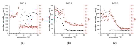 Development of the number mean apparent hydrodynamic diameter (Dh,app) and polydispersity index (PDI) as a function of solution temperature for (a) POC 1, (b) POC 2, and (c) POC 3 thermoresponsive block copolymers carrying the immobilized organocatalyst in aqueous media containing the substrates p-NBA and CH (dot = number mean hydrodynamic diameter, square = PDI).