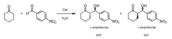 - Gruttadauria, M.; Giacalone, F.; Noto, R. Water in Stereoselective Organocatalytic Reactions. Adv. Synth. Catal. 2009, 351, 33–57. [Google Scholar] [CrossRef]