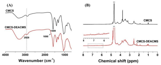 Formation of CMCS-DEACMS was characterized by 1H NMR and FTIR (Figure 1A). In the FTIR spectrum of CMCS, the 3300 cm−1 broad absorption band was attributed to the overlapped stretching vibrations of O–H and N–H. The absorption bands at 2890 cm−1 and 1322 cm−1 could be assigned to the respective C–H stretching and bending vibration [43]. The absorption peak at 1051 cm−1 represents the stretching vibration of C-O, indicating that the carboxymethyl group mainly occurred in the C-6 position [52]. Two absorption bands at 1589 cm−1 and 1416 cm−1 could be assigned to the asymmetric and symmetric stretching vibrations of –COO−, respectively [53]. Compared with CMCS, a new shoulder peak assigned to the carbonyl of ester group was observed at 1698 cm−1 in the spectrum of CMCS-DEACMS. The appearance of an absorption band at 2929 cm−1 corresponded to C–H stretching of DEACMS.