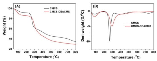 Figure 2 displays the TGA thermograms of CMCS and CMCS-DEACMS. It can be seen that both CMCS and CMCS-DEACMS mainly underwent two decomposition stages. The main loss in the first stage up to 150 °C was due to the loss of adsorbed water. The second decomposition of CMCS, starting from 200 to 800 °C, was due to the decomposition of the polysaccharide [39]. The DTG curves show that the maximum decomposition rate of CMCS occurred at the peak of 267 °C, whereas the CMCS-DEACMS displayed a maximum weight loss rate at 296 °C, which indicates that the thermal stability was enhanced after introduction of the pendant DEACMS groups.