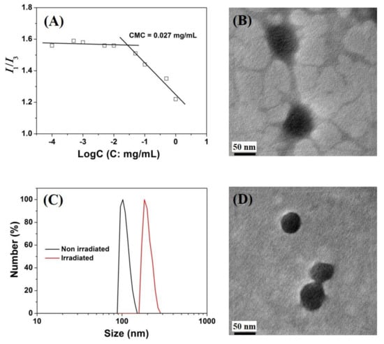 (A) Intensity ratio (I1/I3) of the pyrene emission spectra versus the logarithm concentration of CMCS-DEACMS-2 micelles; (B) TEM images of CMCS-DEACMS-2 micelles; (C) DLS results of CMCS-DEACMS-2 micelles before and after irradiation under simulated sunlight; (D) TEM images of CMCS-DEACMS-2 micelles after irradiation under simulated sunlight.