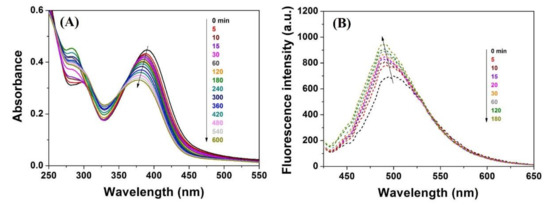 (A) UV-vis and (B) emission spectra of CMCS-DEACMS-2 micelles upon irradiation under simulated sunlight with different irradiation times.