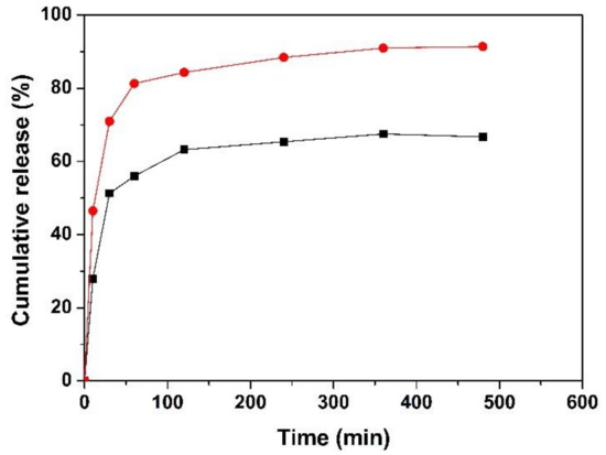 Pesticide carriers with controllable release in response to environmental stimuli are highly attractive in terms of smart “on-demand” delivery and increased efficacy. In previous work, the utilization of amphiphilic micelles for pesticide loading and controlled release has been reported [22,33,60]. In the present work, CMCS-DEACMS-2 was utilized to investigate the pesticide loading and light-responsive release profile by using herbicide 2,4-D as a model pesticide. The EE and LC of the 2,4-D loaded CMCS-DEACMS micelles were found to be 7.25% and 8.7%, respectively. The EE and LC can be readily regulated through adjusting the concentration of the 2,4-D/methanol feed solution. Other LC values were also determined to be 6.72% and 9.54% for 2,4-D/methanol feed solutions with concentrations of 8 mg/mL and 16 mg/mL, respectively. This indicates that a high concentration of the initial pesticide solution would result in a high LC [33]. The light-responsive release curves are presented in Figure 5. The simulated sunlight used in this work was applied as a commercial plant growth light with a spectral output of 320–800 nm, among which the CMCS-DEACMS micelles were photochemically active. Without irradiation upon simulated sunlight, around 65% of the loaded 2,4-D is released within 500 min. However, with irradiation upon simulated sunlight, approximately 90% of the loaded 2,4-D is released within the same period. It is indicated that the release was promoted by irradiation upon simulated sunlight, which derived from the rapid escape of 2,4-D from the destabilized CMCS-DEACMS micelles due to the photocleavage of coumarin groups.