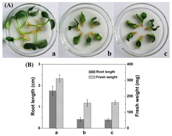 Bioactivity for target plant cucumber. (A) Photographs and (B) root height and fresh weight of cucumber for (a) control with deionized water, (b) free 2,4-D and (c) 2,4-D-loaded CMCS-DEACMS micelles.