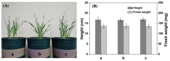 Bioactivity for nontarget plant wheat. (A) Photographs and (B) height and fresh weight of wheat for (a) control with deionized water, (b) free 2,4-D and (c) 2,4-D-loaded CMCS-DEACMS micelles.