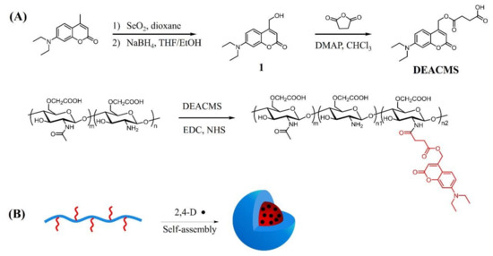 Selenium (IV) dioxide (SeO2), 7-diethylamino-4-methylcoumarin, sodium borohydride (NaBH4), succinic anhydride, potassium carbonate (K2CO3), 4-dimethylaminopyridine (DMAP), 1-ethyl-3-(3-dimethylaminopropyl) carbodiimide(EDC), N-hydroxysuccinimide (NHS) and 2,4-D were obtained from Aladdin Reagent Co. (Shanghai, China). Carboxymethyl chitosan with a degree of substitution of 0.8 was purchased from Shanghai Yuanye Biological Co. (Shanghai, China). The degree of deacetylation (DD) was determined to be 0.96, according to a method described in the literature [41]. Dioxane, tetrahydrofuran (THF), ethanol (EtOH), HCl, dichloromethane(CH2Cl2), chloroform (CHCl3), dimethylsulfoxide (DMSO), petroleum ether and ethyl acetate were purchased from Beijing Chemical Reagent Co (Beijing, China). Dialysis bag (MWCO, 3.5 kDa) was obtained from Union Carbide Co. (Danbury, CT, USA). Nitrogen was provided by Guiyang Shenjian Gas Company (Guiyang, China). Deionized water was used throughout the work.
