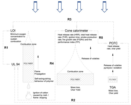 Figure 1. Concepts behind Underwriter Laboratories (UL) 94, limiting oxygen index (LOI), cone calorimeter, thermogravimetric analysis (TGA) and pyrolysis combustion flow calorimetry (PCFC). Some correlations observed in the literature between different tests are also shown [4,10].