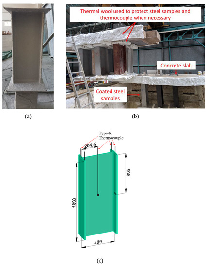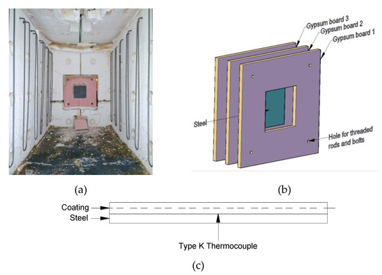 The bulk-scale furnace tests were carried out using an electric furnace of dimensions 0.7 m wide by 0.85 m deep by 1.7 m long, which is capable of closely simulating the ISO 834 standard fire curve (Figure 2a). The coated steel plates were encased with gypsum boards (thickness of 15 mm) to restrict heat transfer to a single face (one-directional heat transfer) (Figure 2b) [32]. This provided a controlled setup that was convenient to prepare for bulk-scale tests of coated steel samples. Fire-retardant coatings with two different dry film thicknesses (≈2.5 mm and ≈5 mm) were studied. A type-K thermocouple was used to record the temperature development of coating–steel interface (Figure 2c). The result of one bulk-scale furnace test is discussed in this manuscript.