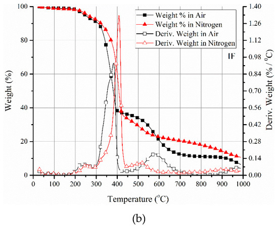 The mass loss rate of the sample with temperature was measured using a TA Instruments SDT Q600 (New Castle, USA). The samples, weighing 8 to 10 mg, were placed in a sample holder (e.g., alumina cup or platinum pan) and heated up to 900 °C with a heating rate of 0.33 K/s. Air or nitrogen was supplied into the chamber to simulate an oxidative or pyrolysis environment, respectively. The tests were repeated once to ensure repeatability of data.