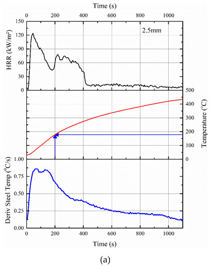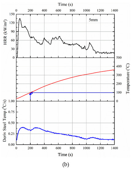 Interestingly, the above observations on the increase in temperature of the steel substrate due to pyrolysis also hold for a 1D heat transfer (bulk) test. As the heating rates in the first 10 to 15 min in the ISO 834 fire curve are on par with the imposed heating rates in PCFC (Table 2) or higher temperature gradient experienced in the cone calorimeter, a higher value of peak HRR is expected in the furnace test during the initial period. This is due to the higher volume (thickness) of material involvement in the pyrolysis. This results in ignition/flaming of the sample until the HRR values are lowered due to the formation of an insulating barrier. As a result of this, the initial steep gradient in the derivative time–temperature profile of the underneath substrate is noted in Figure 8. With 2.5 mm thick coating, at 15 min, the steel temperature was 214 °C, and with 5 mm thick coating, it was about 149 °C. As shown in Figure 7a,b, a similar trend was observed even with the temperature profiles obtained from cone calorimeter tests.