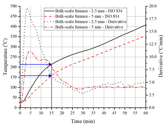 Figure 8. Time–temperature profiles and derivative curves obtained from steel substrate with 2.5 and 5 mm intumescent coating when exposed to ISO 834 fire curve in an electrical furnace.