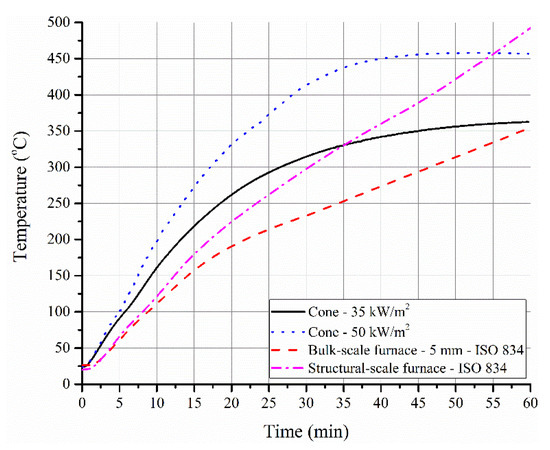 In Figure 9, the time–temperature profiles for the steel substrate obtained in the cone calorimeter, bulk- and structural-scale tests are presented. Generally, a developing fire is characterized by an external heat flux of 20 to 60 kW/m2, while a fully developed fire is characterized by an external heat flux much greater than 60 kW/m2 [9]. Cone calorimeter data obtained with heat fluxes of 35 and 50 kW/m2 are shown in Figure 9. It is interesting to note that the time–temperature profiles obtained with cone calorimeter (at both 35 and 50 kW/m2) showed a parabolic nature with decreasing gradient and attained almost a plateau in temperature after 35 min into the test. The swelling of the sample and the formation of an expanded graphite network resulted in a change of irradiance imposed on the sample. As the oxidation of this network seemed to be relatively absent under the imposed conditions, it caused a constant temperature profile after 35 min. However, in the actual furnace tests (both electric and gas-fueled), the plateau was not noticeable due to relatively higher temperatures and possibly higher flux imposed on the sample. Therefore, the behavior of structural-scale tests deviated from the heat release rate plots obtained in cone calorimeter tests. Other factors such as the thickness and extent of swelling might further influence the differences while comparing cone calorimeter data with furnace data.