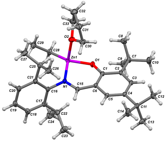 The complex 4 was obtained earlier by Darensbourg et al. in aliphatic reaction media [105]. To establish the ability of the Zn atom to binding with donor ROP substrates, we prepared single crystals of 4 by low-temperature crystallization from hexane solution in the presence of donor solvent, THF. X-ray diffraction analysis of 4 (Figure 2, see also Figure S6 in the Supplementary Materials for ORTEP drawing) confirmed the monomeric nature of the complex, we found that the Zn atom was bonded to one THF molecule. The Zn environment in 4 was best described as a distorted trigonal pyramid (coordination number is 4; see Table 4 for Zn-L bond distances), where Zn was located nearly within the plane defined by atoms O1, N1 and C28 (the deviation was 0.3096(9) Å). Atoms C1–C6 and C15 were also situated in the same plane. Such an unusual Zn environment is mainly caused by the presence of the flat fragment in the C27H38NO ligand and by the steric influence of the bulky (2,6-iPr2C6H4) substituent located close to the Zn atom.