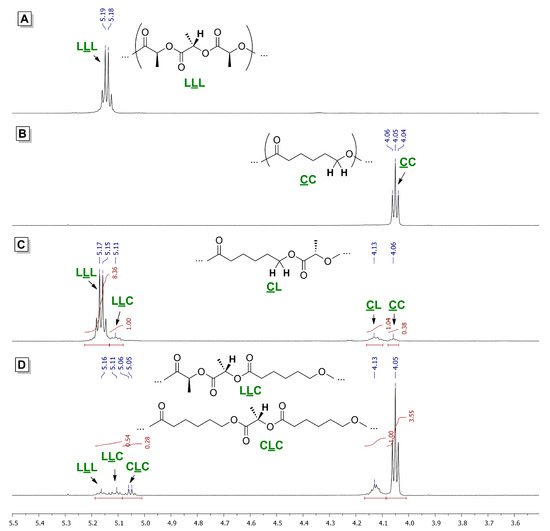 1H NMR spectra (CDCl3, 20 °C, 600 MHz) of PLLA (A), PCL (B) and lLA/εCL copolymers obtained at the 1:5 lLA/εCL ratio using complexes 1 (C) and 3 (D).