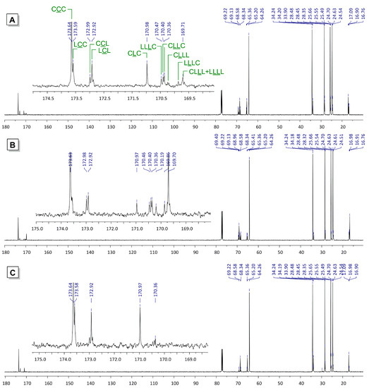 13C NMR spectra (CDCl3, 20 °C, 151 MHz) of the products of lLA/εCL copolymerization using 3 (A) and 4 (B) as a catalysts, and transesterification of PLLA by εCL in the presence of 3 (C).