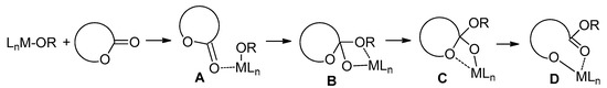 Coordination ring-opening polymerization of cyclic esters: (A) monomer coordination; (B) nucleophilic addition to carbonyl group; (C) coordination of endocyclic oxygen and (D) ring-opening.