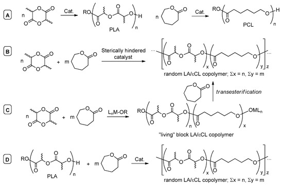 Homopolymerization (A) and random copolymerization (B) of LA and εCL, formation of random LA/εCL copolymers via transesterification of PLA (C,D).