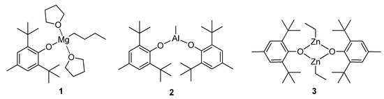 To estimate the catalytic performance of the BHT derivatives of Mg, Zn and Al, we chose the complexes (BHT)Mg(THF)2nBu (1) [97], (BHT)2AlMe (2) [100] and [(BHT)ZnEt]2 (3) [101] (Scheme 3). In our experiments on homopolymerization of lLA and εCL, we used activation of alkyl complexes 1–3 by BnOH.