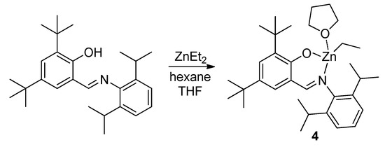 Zn complex 4 was prepared using the previously reported method [105]. Single crystals of the complex 4 were obtained by low-temperature crystallization from hexane/THF solution. X-ray diffraction data were collected at 100 K on a Bruker Quest D8 diffractometer using MoKα radiation (λ = 0.71073 Å). The intensity data were integrated by the SAINT program [106] and corrected for absorption and decay using SADABS [107]. The structure was solved by direct methods using SHELXT [108] and refined on F2 using SHELXL-2018 [109]. All non-hydrogen atoms were refined with anisotropic displacement parameters. Hydrogen atoms were placed in ideal calculated positions and refined as riding atoms with relative isotropic displacement parameters. The Mercury program [110] was used for molecular graphics. The structure has been deposited at the Cambridge Crystallographic Data Center (CCDC) with the reference CCDC number 2021607; it also contains the supplementary crystallographic data. These data can be obtained free of charge from the CCDC [111]. Crystal data, data collection and structure refinement details for 4 are summarized in Table S1 in the Supplementary Materials, bond lengths are presented in Table S2 in the Supplementary Materials.