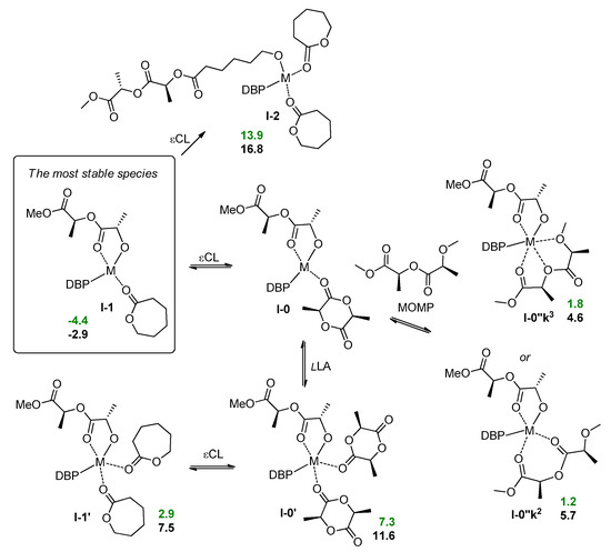 Calculated thermodynamic data for ligand exchange and εCL ring-opening during lLA/εCL copolymerization. The values of the free energies (kcal/mol) relative to I-0 are colored by green for Mg and by black for Zn.