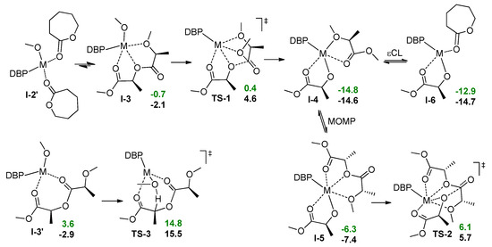 Calculated thermodynamic data for ligand exchange and transesterification during lLA/εCL copolymerization. The values of the free energies (kcal/mol) relative to I-2’ are colored by green for Mg and by black for Zn.