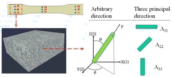 During the injection molding processing, the orientation of the fiber inside the FRP composite will be affected by the polymer fluid mechanics. In general, the orientation of a single fiber can be at an arbitrary direction, or at one of the three principal directions, as shown in Figure 1. However, since there are hundreds of thousands of fibers inside the polymer matrix in injection molding, it is too difficult to observe manually. Instead, to predict the fiber orientation kinetics, each single fiber is theoretically regarded as an axisymmetric bond with rigidness. The bond’s unit vector p along its axis direction can be described as the fiber orientation. The orientation state of a group of fibers is given by the second-order orientation tensor,