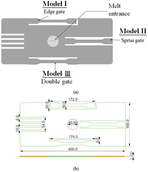 (a) The geometrical structure with three ASTM D638 specimens of different gate designs; (b) the dimension of the full sample.