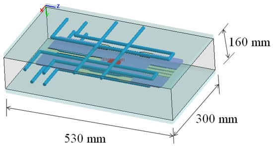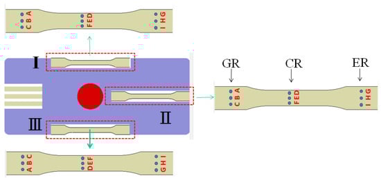 The geometrical model is shown as in Figure 2. Specifically, the dimension of the whole model is 400 mm × 165 mm × 3 mm. There are three standard specimens based on ASTM D638, marked as Model I, II, and III, respectively. The dimension for each standard specimen is 172 mm × 20 mm × 3 mm. To study the flow field behavior, we have designed those three models with different gate types. In particular, one has an edge gate, another has a sprue gate, and the other has a double gate, as presented. To fill the polymer melt into those three specimens, there is one plunger type melt entrance with 40 mm diameter that is located in the center of the cavity. Moreover, the moldbase and cooling channel layout are presented in Figure 3.