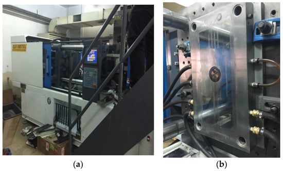 Machine and equipment setup: (a) Injection machine (Chuan Lih Fa Machinery Works Co., Model: CLF-180TXL), (b) the mold and cooling channel layout.