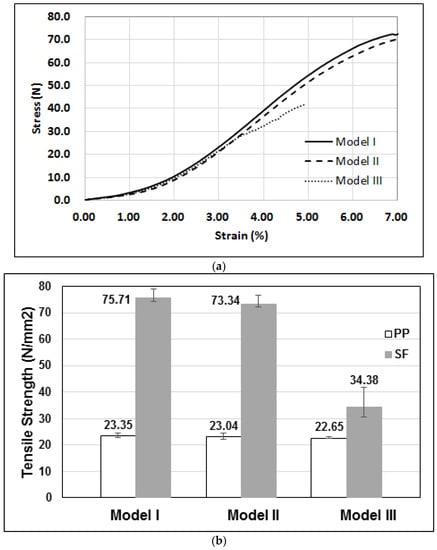 The mechanical properties of the PP-SF material with three different models, (a) the stress–strain relation, (b) the tensile strength properties.