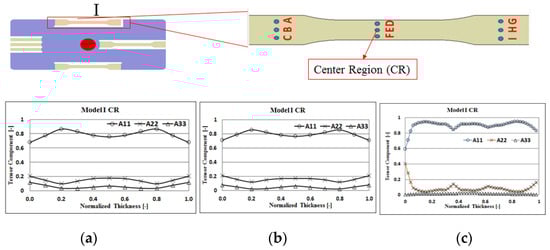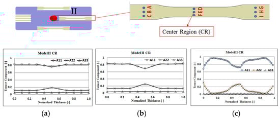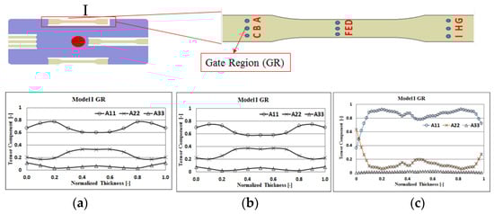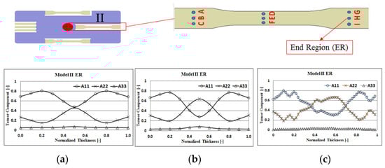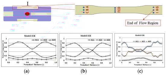 Moreover, considering the center region (CR), Figure 8a shows the FOD predicted numerically at Point E for Model I in the absence of flow–fiber coupling. The flow direction orientation tensor component A11 is increased from 0.7 to 0.85 at the skin-layer then decreased to 0.75 at the core-layer. Overall, the fiber orientation is still dominant along the flow direction at CR. In addition, Figure 8c shows the FOD observation experimentally. The flow direction orientation tensor component A11 is around 0.6 to 0.95 at the skin-layer then decreased to 0.85 at the core-layer. It also shows that the dominant fiber orientation is at the flow direction in experiments. Once again, the simulation prediction of the FOD in the absence of flow–fiber coupling is in a reasonable agreement with that of the experimental result for Model I at CR. Moreover, the simulation results of the fiber orientation tensor components for both without and with flow–fiber coupling for Model I at CR are very similar, as shown in Figure 8a,b. Due to the stronger shear rate (shear force) by the convergent section, the flow–fiber coupling is not significant at this region.