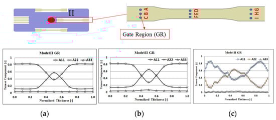 Moreover, Figure 10a presents the FOD predicted numerically without consideration of flow–fiber coupling at Point B for Model II at GR. The flow direction orientation tensor component A11 is 0.82 at the skin-layer then decreased to 0.4 at the core-layer. The fiber orientation is dominant at the flow direction A11 at the skin-layer and then changes to the cross flow direction A22 at the core-layer. Similarly, Figure 10c exhibits the FOD observation experimentally at Point B for Model II. It shows that the simulation prediction of the FOD without consideration of flow–fiber coupling is consistent with that of the experimental result for Model II at GR in the trend. However, the width of the core-layer by experimental observation is wider than that of simulation prediction. Furthermore, in Figure 10a,b, there is some difference on the simulation results of the fiber orientation tensor components between both without and with flow–fiber coupling cases for Model II at GR. Specifically, under the influence of flow–fiber coupling, more fibers will stay at the cross flow direction A22 at the core-layer, as shown in Figure 10b. The trend of the coupled case is more consistent with the experimental observation, as shown in Figure 10c.